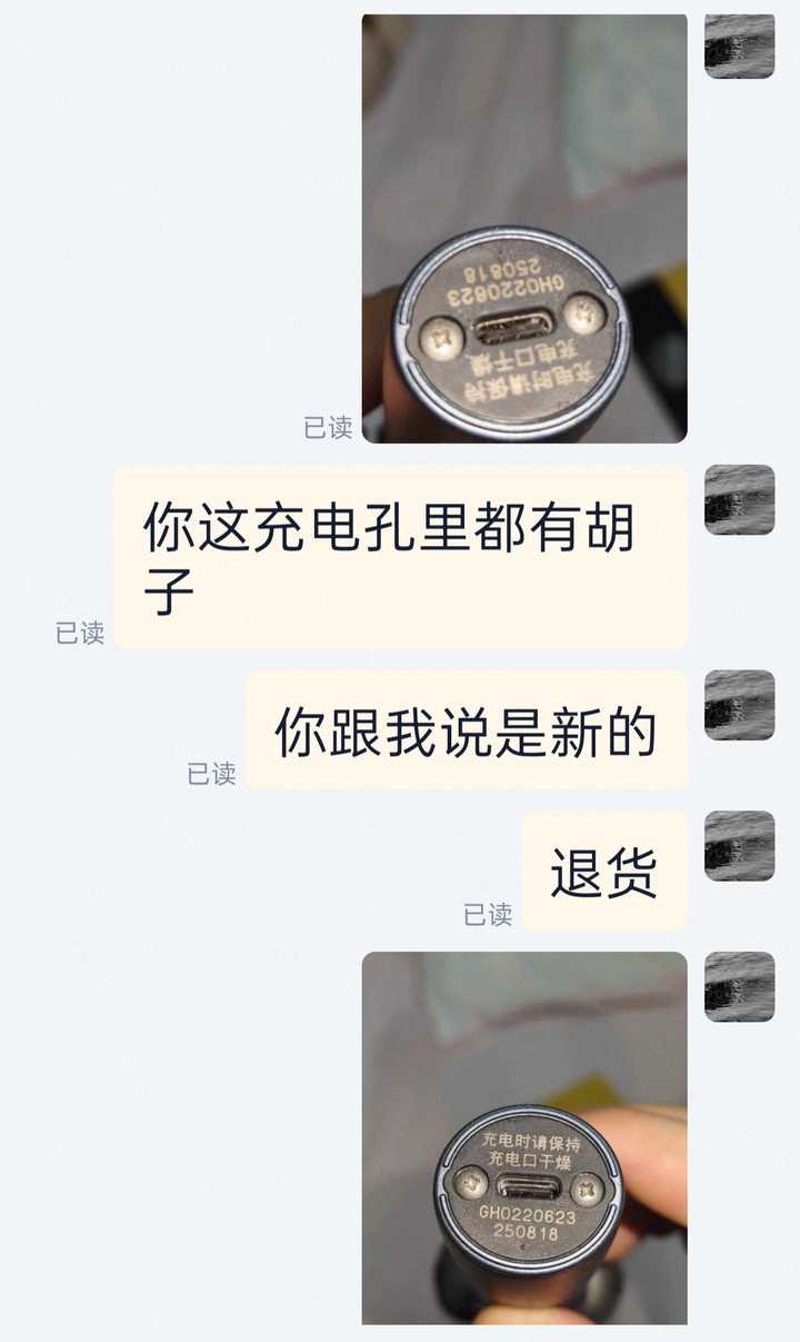 我放张清楚点的图片,当时看见充电口里都是胡渣我都有点懵,太离谱了。 商家说可以补偿我20块钱。 我说你有没有搞错,这是剃须刀,你用二手剃须刀吗? 我直接退货了,退完货越想越气,我就准备上315投诉,但我以前投诉过一家卖假货的玩具店,基本没啥效果,所以我就去找淘宝客服,我的诉求很简单: 连他冯的剃须刀都敢卖二手货,你淘宝准备怎么处理这个商家? 淘宝客服比商家还能扯皮,表示尊贵的88vip,可以给您退货退款哟。 我说我找你就是想问问,卖二手剃须刀是不是该罚。 |
