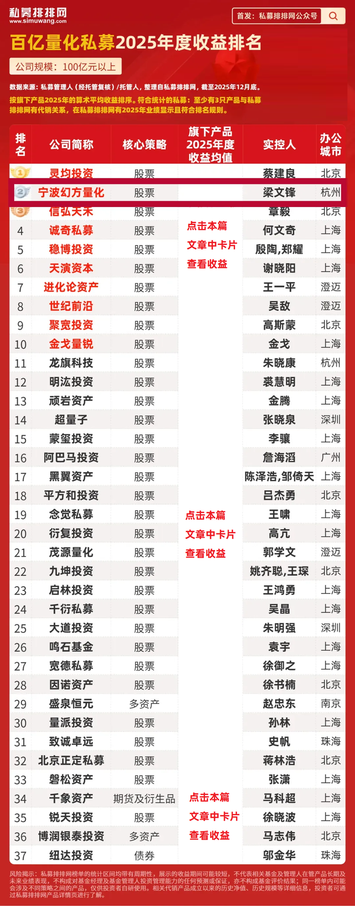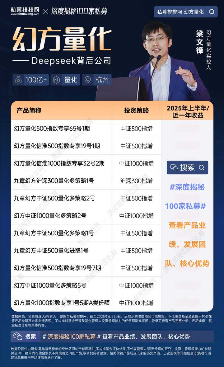 梁文锋的幻方量化夺百亿量化私募2025年收益第二!10只产品全创新高!怎么做到的? 本文我们来深度揭秘量化巨头幻方量化。幻方量化实控人为DeepSeek创始人梁文锋,旗下有宁波幻方量化、九章资产两家私募,公司管理业绩和规模均位居国内前列。 在私募排排网最新发布的2025年度百亿量化私募收益榜中,幻方量化排名第二。在百亿私募收益榜中(数据截至2025年12月底),幻方量化在2025年、近3年、近5年收益排名皆进入前十名。 |