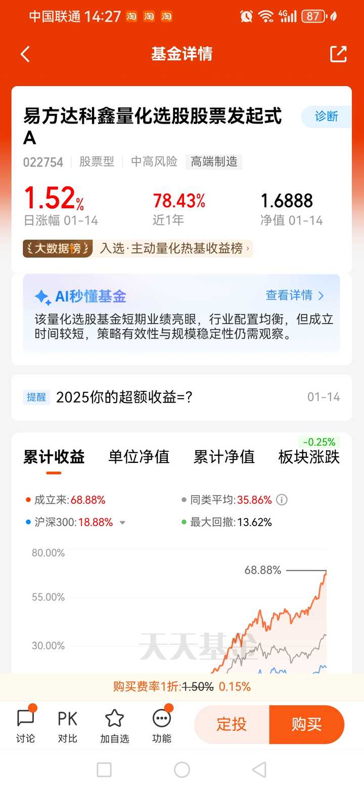 易方达科鑫量化 24.12.31基金净值0.9660 25.12.31基金净值1.5477 收益率55.39% |