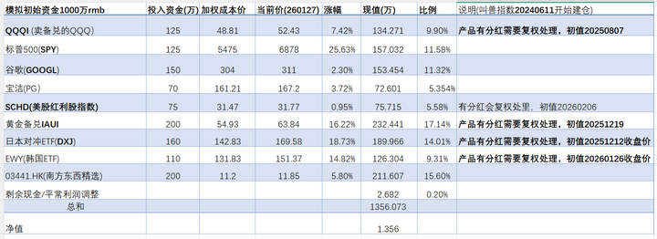 上期的叫兽指数,每期都有合订本复核仓位成绩,经得起市场检验。 之前大幅减持了纳指和标普,理由在于市场已经很明确地对AI Infra的高资本开支表示不信任。甲骨文微软亚马逊都因为这个原因暴跌,谷歌的infra成本算低的,也受了较大冲击,从高点回撤了大概7%。 本周英伟达业绩虽然大超预期,但同样因为这个原因股价先大涨后大跌。 从结果上来看,叫兽指数大幅减持纳指和标普确实是对的。新配置的宝洁,3441和之前就有的黄金备兑ETF(IAUI),日本对冲ETF DXJ走势非常理想稳健,春节前后加入的EWY(韩国ETF)表现更是令人惊喜。叫兽指数的净值从1.311 上升到 1.355 本次无调仓,叫兽指数里的成分可以一次性跟随调整到位。因为里面没有放ALM/7709/LYNAS这种高波动的,基于交易性质的标的。 |