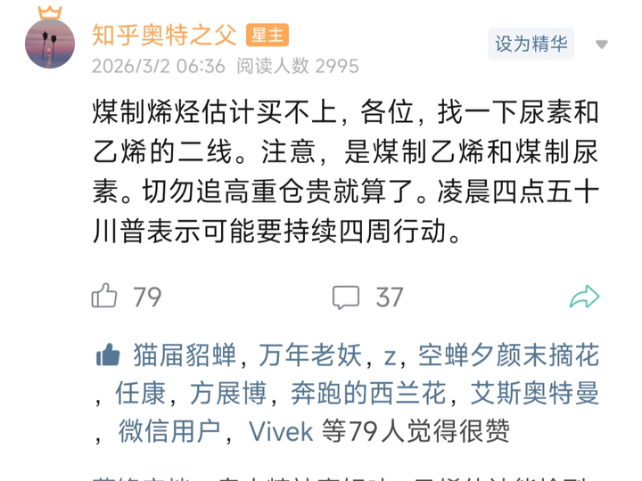 但是20万桶不算什么,还得看未来增产规模。 布油目前79美元附近,涨幅8个点。 参与相关板块的股票风险还算可控,期货千万别碰。 3,利好LPG: 同口径占比是11%左右 4,利好PE:同口径占比是2.5%左右,相对小一些。 5,利好海运:要改变线路,绕远路,价格大幅度上升。 以上这些算是主流共识,大家在别的地方也能看到,就不多赘述了。 我再补充点其他的: 1,利好甲醇,乙二醇和煤化工。 中国60%左右甲醇进口来自伊朗,占国内消费量的11%。 这种情况下不但有涨价的预期,而且可能以前因为担心产能过剩而搁置的新增产能也有更大的落地预期。 同时,在目前能源安全受到影响的情况下,能源安全就被摆到了台面上。 有些投资者会认为速战速决后,影响会降到最低。 但是假设一个不那么亲近咱们的班子上台,还会以比较优惠的价格持续保障咱们的能源供应么? 就算他肯卖,咱们要不要摆脱依赖? 2,利好硫磺。这个知道的人不多,自伊朗进口的硫磺每年是50万吨级的。 3,利好锶。 天青石又叫硫酸锶。 从伊朗进口的天青石占进口总量的60%以上。 高端的锶盐严重依赖进口天青石。 4,利好AI+军事。这次行动中西大使用了一系列来自暗黑版AI的部署方案,多线并行,效率提升数倍,远超人类军事家。 5,利好开心果,自伊朗进口的开心果占30%以上。 这个没标的,嘴馋的赶紧囤两包,说不定要涨价了。 动作要快,来不及解释了。 风险提示:必看! 按照以前多次的历史经验,战争开打后对以上提及的利好板块会有一定的提振效应。 但随着时间延长,会越来越倾向于战后逻辑的预期交易。 黄金石油反而下跌。 所以还是那句话,要么早信,要么不信,半路追进去,风险很大。 股神巴菲特交出最后一份成绩单: |