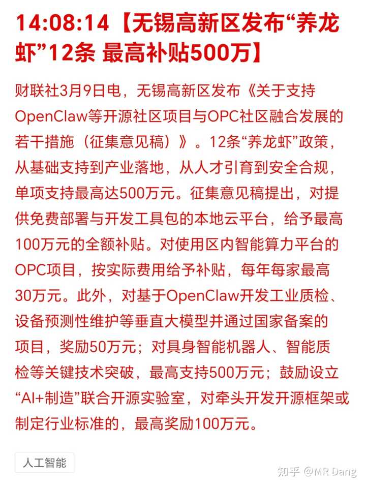这个目前已经不是概念炒作了,是真正可以形成生产力,并且有配套政策支持的。 除了昨天介绍过的“龙虾十条”,无锡也跟进了“龙虾十二条”,最高补500万: |
