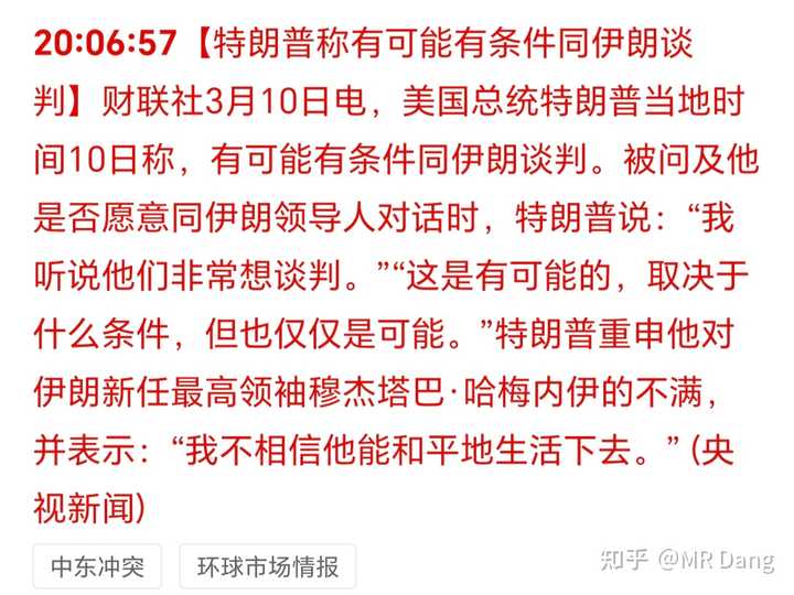 现在的话,其实懂王和伊朗,都不想打了,但是两边的头头都需要展示强硬来取得来自下面的支持。 需要一个有眼力见的中间人去巧妙的递一个梯子,让两边都能从台阶上下来,体面的坐到谈判桌上。 天兵: |