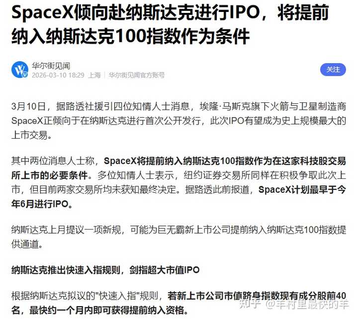 1,据华尔街见闻消息:埃隆·马斯克旗下火箭与卫星制造商SpaceX正倾向于在纳斯达克进行首次公开发行,此次IPO有望成为史上规模最大的上市交易。 解读:纳斯达克为SpaceX推出快速入指规则,剑指超大市值IPO。埃隆·马斯克简直是比三维度人类还厉害,回顾一下他的超前言战绩?:从X Corp.?(原Twitter)---xAI(人工智能)---Tesla(特斯拉)?---SolarCity?(光伏能源)---The Boring Company(隧道交通领域)---Neuralink(脑机接口)---SpaceX?(太空探索技术公司) 突然发现短短几年埃隆·马斯克已经布局人工智能、智慧交通、脑机接口?,新能源、太空等几乎把人类所有重要的领域都尝试了遍甚至有些接近成功了。或许未来只剩下人类意识的延续才是他最终的目标。当然了,大A的每次转折起伏都与马斯克息息相关,这次盘后SpaceX的消息刺激下或许明天又来一波反弹。难怪尾盘航天强势神龙摆尾。 |