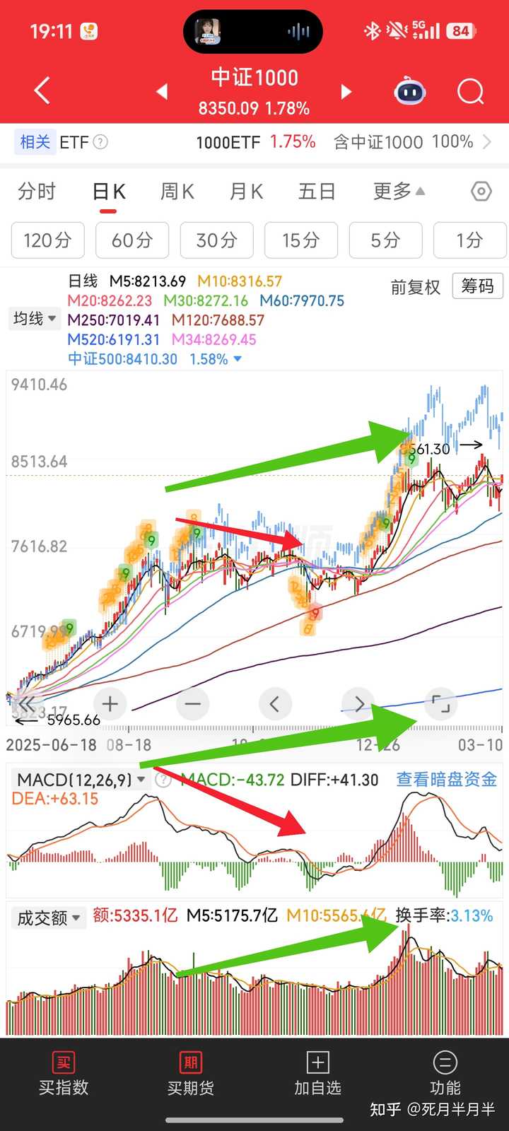 首先1000指数的8561点,是即将出现的周线顶背离加已经出现日线级别的顶背离共振。上一次出现这种情况是25年3.19日,后续叠加贸易战的黑天鹅,来了一把大的,当然那一次是周线顶背离确认了。 首先,我们要理解一个事情,技术指标尤其macd代表的是量能与价格的结合体。当出现信号,说明必然是有聪明资金提前做出来预判选择。那么我们可以想一想最近有什么资金在做卖出动作。而1000指数周线级别的diff钝化也可以说明这里的风险性。 其次,消除顶背离的两个条件,一个是放量:通过放量拉升,形成第三个diff水上接力,高过前背离形成的diff即可。类似下图,也就是经常被人吐槽说,背了又背,离了又离。其实就是量能不退,趋势不止。 |