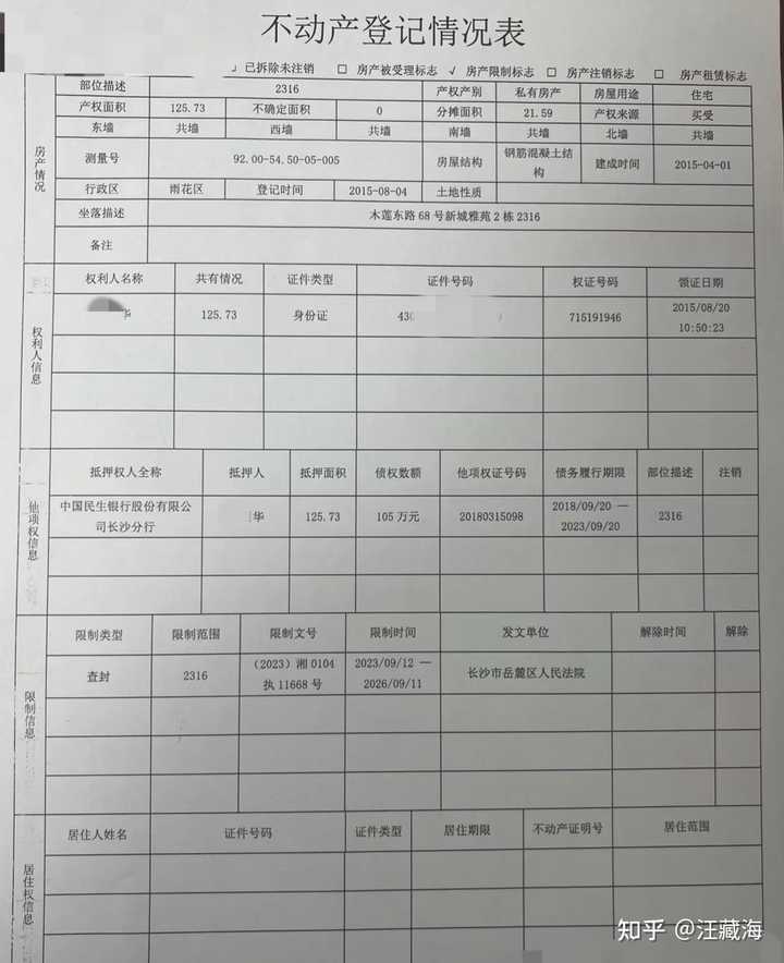 上面是一张《产调表》,也就是不动产登记中心登记的不动产信息中可以给司法机关和权利人、利害关系人看的部分,拍卖公告中也常常以附件的形式提供。 上面这张是长沙市内五区的产调表,外四区格式不同,记载的内容也大致相同。你会看这张表,其他省市的产调表也能看懂,毕竟法律法规在全国是通用的。 现在我分别教大家看产调表的几个部分。 —— |