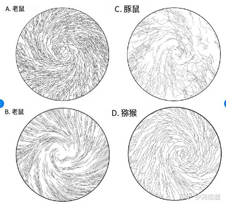 角膜神经 (这是几种不同动物的角膜神经,以对螺旋模式在角膜的浅表皮层附近终止)。 |
