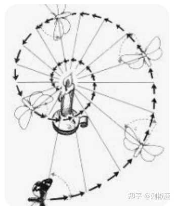 昆虫到光源:它们习惯于将光源与飞行路径保持恒定角度。通常,太阳(或夜间物种的月亮)是唯一的光源,以这种方式飞行将导致几乎直线。 但是人造光源离得太近,虽然它们夹角恒定,但是会导致越飞越近造成飞蛾扑火的现象。螺旋星系的臂。我们的银河系,有几个螺旋臂,每个螺旋都大致是一个对数螺旋,螺距约为12度。 |