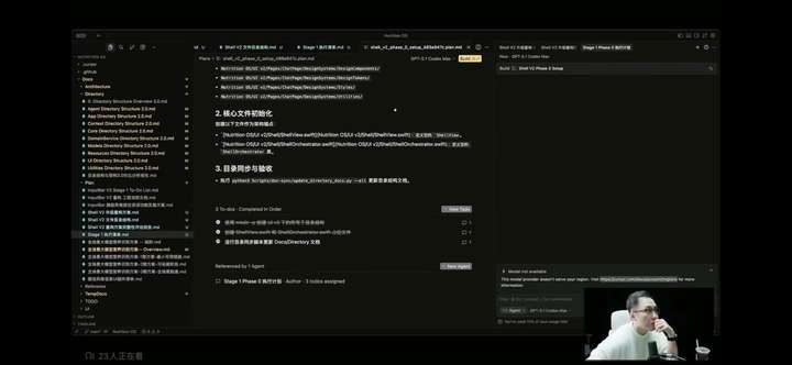 没看直播,点了个录像看,随便点了几个时间点看了下 cursor编辑器(swift的文件,是iOS软件吗,我不懂iOS) “我现在15w行代码的规划量了,不能随便改,看我左边这些,文件都巨大” 然后在左边点几个文件打开看(不知道是不是想让观众看大文件),好几个50行以内,好多都是注释,还有单纯的import的文件,就几个md说明文件内容巨大,几千行(没找到有大量代码的文件) 和ai对话 “总觉得哪里不太对” ai回复是有基础可能会成为坑(他是不知道哪几个模块会容易出问题吗?他这种话完全是万金油,你问哪个ai,哪个ai不会这样回答?) 说自己在家里用不了个gemini3,这里能用,然后显示model不可用的报错,还翻译了错误提示,提示说明在地区不可用,可以访问XX获取更多信息 这个在家里不能用,也是会有提示的,现在才来看、来翻译、煞有介事地表示明白了,是没用过还是没看过,而且好像第一次看到这样的报错,看翻译的情况 “我觉得不干净,有没有做项目的这种强迫症” “程序员都懂,是,我们都说优雅” 要是真有强迫症,也不会把md文件搞那么大,方案有【细则】【overview】【最小可用链路】【可扩展阶段】【全流程跑通】(流程跑通不应该是什么时候都要跑通的吗?) 他是语音输入和ai对话的,不知道情况常见不常见,我本人有口音都是打字的 就随便看了几个时间点,我觉得他可能是 |