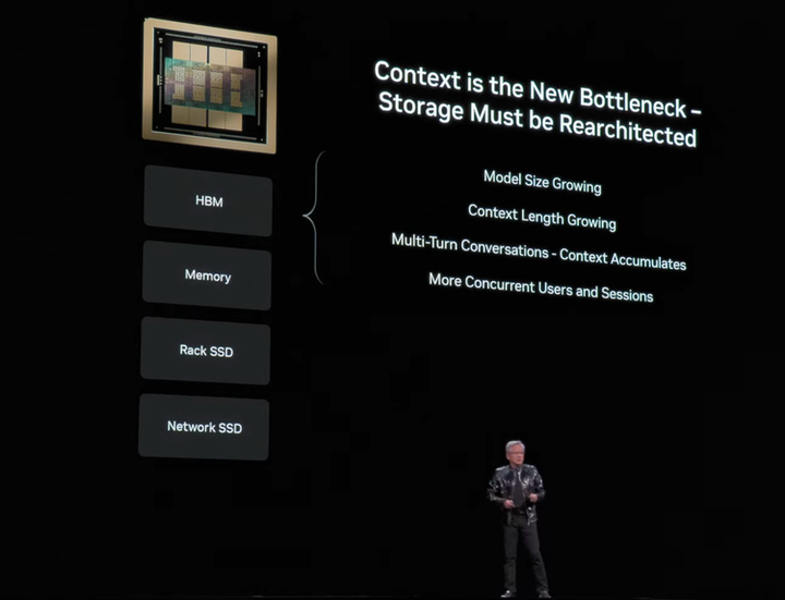 KV Cache成了新瓶颈,BlueField-4来解决 黄仁勋特别强调了一个正在浮现的问题:context memory正在成为新的瓶颈。 |