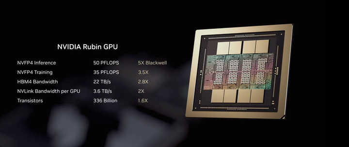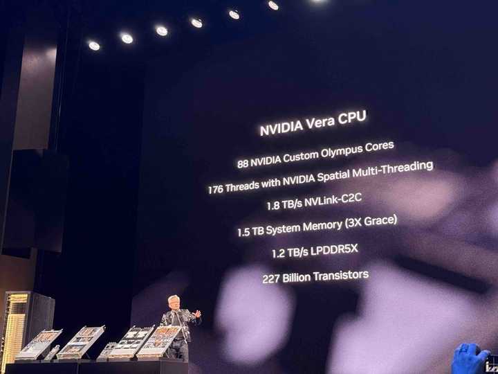 NVIDIA Rubin GPU规格图 最关键的数字是这个,NVFP4推理性能达到50 PFLOPS,是Blackwell的5倍,但晶体管数量只有3360亿,仅增加了1.6倍。这意味着架构效率的巨大飞跃,而不仅仅是堆料。HBM4带宽达到22 TB/s(2.8倍),单GPU的NVLink带宽达到3.6 TB/s(2倍)。 这背后是NVFP4 Tensor Core的创新——一种新的4位浮点格式,通过硬件层面的自适应精度调节和动态transformer引擎实现。黄仁勋暗示这可能成为行业标准:“我不会惊讶于整个行业都希望我们把这个格式和架构变成行业标准。” Vera CPU:88个自研核心,不是ARM公版魔改 全新的自研CPU采用88个Olympus核心,176线程,1.5TB系统内存(是Grace的3倍),1.2 TB/s的LPDDR5X带宽,2270亿晶体管。 |