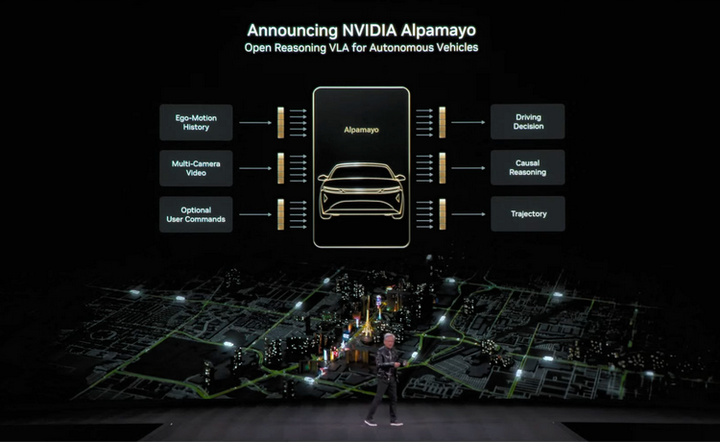 Alpamayo:物理AI的ChatGPT时刻 算力基础设施最终是为了让AI理解和操控物理世界。除了造“大脑”,英伟达也在教AI控制“身体”,演讲中另一个值得注意的发布是Alpamayo。 |