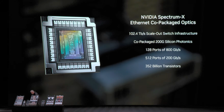NVIDIA Spectrum-X Ethernet Co-Packaged Optics规格 这颗芯片采用TSMC的COUPE工艺,实现102.4 Tb/s的交换机基础设施,128个800 Gb/s端口,512个200 Gb/s端口,3520亿晶体管。黄仁勋说这让英伟达“成为了全球最大的网络公司”。 配合新一代NVLink 6.0,单GPU带宽达到3.6 TB/s,整个NVL72系统的互联带宽达到260 TB/s。黄仁勋的比喻是,“这是全球互联网带宽的两倍”,全球互联网总带宽大约是100 TB/s。 |