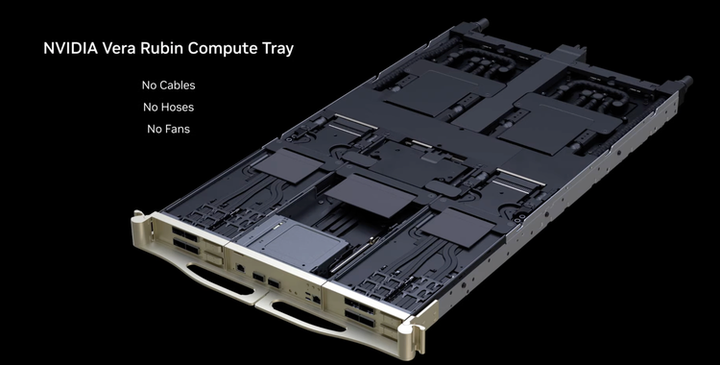 NVIDIA Vera Rubin Compute Tray 新的计算托盘设计是“No Cables, No Hoses, No Fans”,无线缆、无水管、无风扇。过去组装一个计算节点需要2小时,现在只需要5分钟。黄仁勋在台上亲自演示,把托盘像抽屉一样滑入机柜。 整个系统100%液冷,使用45°C的热水,不需要冷水机。"今天这台机器重2.5吨,因为他们发货的时候忘了把水放掉",黄仁勋开玩笑说。整机包含2英里的铜缆和5000根线缆,但因为采用了新的无线缆托盘设计,实际部署时的复杂度大大降低。 虽然性能是Blackwell的5倍,但热设计保持在同一水平,这意味着在相同的数据中心功率预算下,可以获得5倍的算力提升。 |