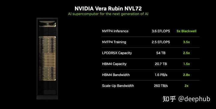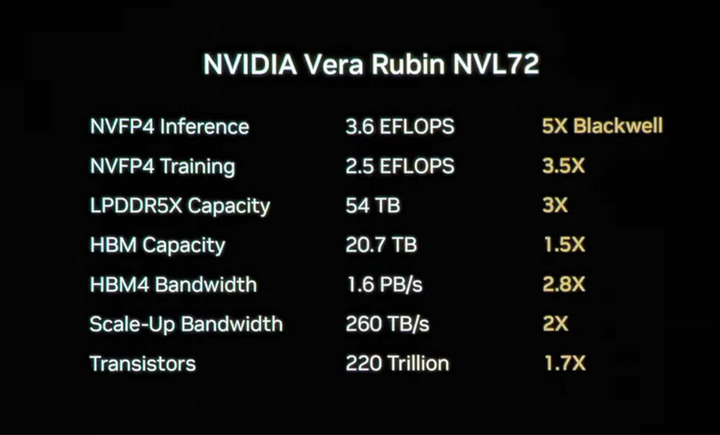 这是一个完整的机柜级计算单元:3.6 EFLOPS的FP4推理算力(5倍于Blackwell),2.5 EFLOPS的FP4训练算力(3.5倍),54TB的LPDDR5X容量(3倍),20.7TB的HBM容量(1.5倍),1.6 PB/s的HBM4带宽(2.8倍),260 TB/s的Scale-Up带宽(2倍)。整个机柜包含220万亿个晶体管。 |