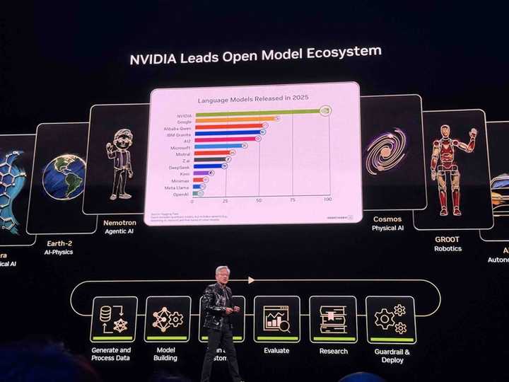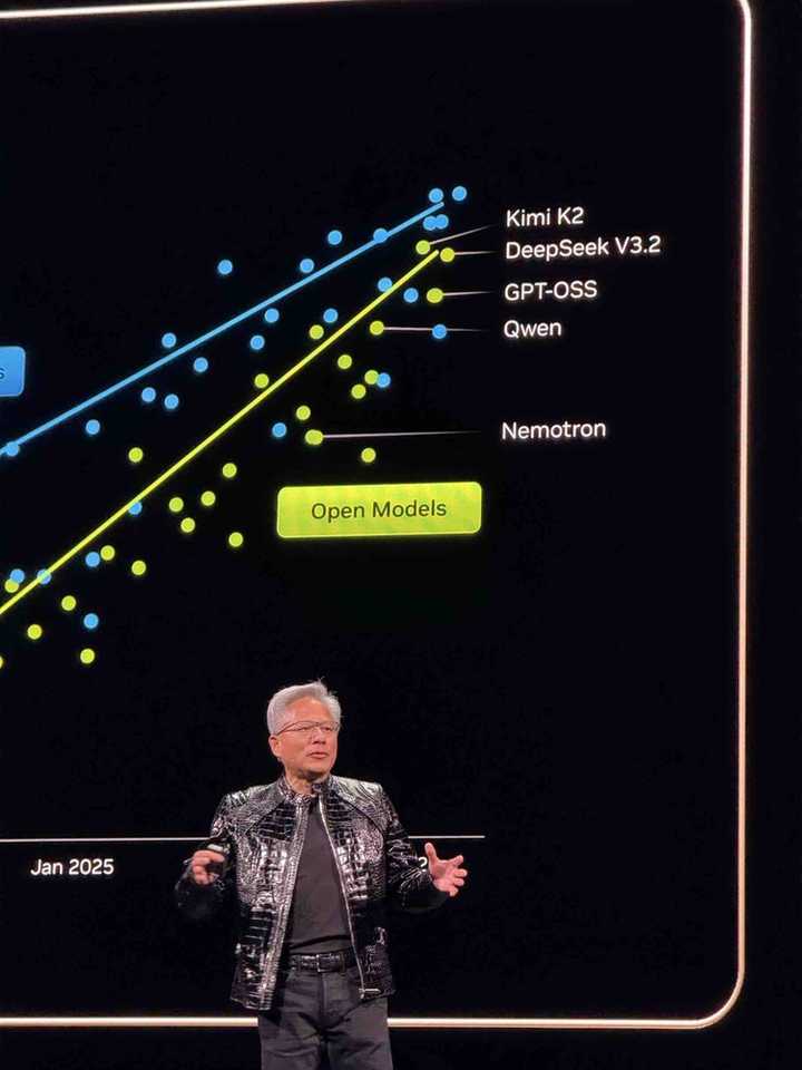 NVIDIA Alpamayo架构 这是一个开源视觉-语言-动作模型(VLA),专为自动驾驶设计,支持chain-of-thought推理来处理边缘场景。输入是多摄像头视频、自车运动历史、可选用户指令,输出是驾驶决策、因果推理、轨迹规划。 演示视频中称之为“物理AI的ChatGPT时刻几乎就要到来了”(The ChatGPT moment for physical AI is nearly here)。首个商用落地是Mercedes-Benz CLA,2026年Q1在美国上市。 值得注意的是,英伟达不仅开源了模型,还开源了训练数据。“我们不仅开源模型,还开源用来训练这些模型的数据。因为只有这样,你才能真正信任这些模型是怎么来的。” 黄仁勋演讲PPT里用到了很多中国开源模型的数据: |