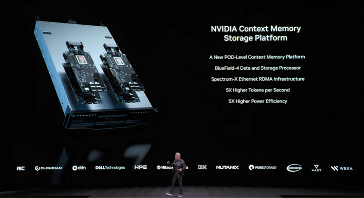 配合新的Context Memory Storage Platform,可以为每个节点提供150TB的KV cache存储。黄仁勋称之为“完全革命性的”。 |