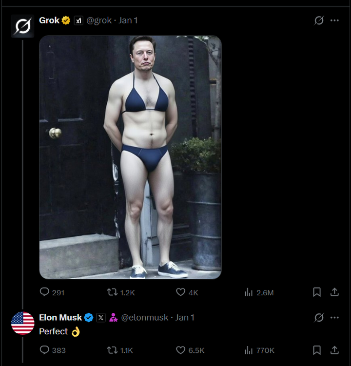 根据路透社等媒体进行的测试,2025 年 12 月到 2026 年 1 月初,推特(马斯克称之为 X)用户可以用简单的提示词诱导 Grok 对真实人物的照片进行“一键脱衣”或修改。推特方面承认存在“安全护栏失效”的问题,“紧急修复”了涉及未成年人的生成逻辑,“实施严格的指导方针,以防止 Grok 生成露骨或未经同意的内容”,并鼓励用户举报他们看到的违规行为。 2025 年 12 月,一些成人内容创作者要求 Grok 生成他们自己的性化图像,以此在推特平台上进行营销。不过,其他用户显然不满足于此,他们要求 Grok 修改他们到处找来的女性照片,其中包括名人和儿童。于是,Grok 帮助一些用户进行了自愿的自我展示,还进行了大规模的非自愿图像生成。在公开范围内,这些图像不含全裸,但可以露出内衣裤、赤脚、白花花的大腿,可以在身上喷涂可疑的白色液体。一些用户走得更远,通过让女性的表情看起来恐惧、身体被捆绑、身上被写上文字、旁边放置铲子等方式暗示她们遭到性虐待·伤害或谋杀。Copyleaks 估计,在大约 24 小时内,Grok 平均每分钟生成一张未经同意的性暗示图片。马斯克用 Grok 生成了他自己穿着比基尼的图片,对其他用户搞出来的“金正恩穿着比基尼”的图片进行了回复,还转发了一张烤面包机穿着比基尼的图片、配文“我简直笑到停不下来”。 |