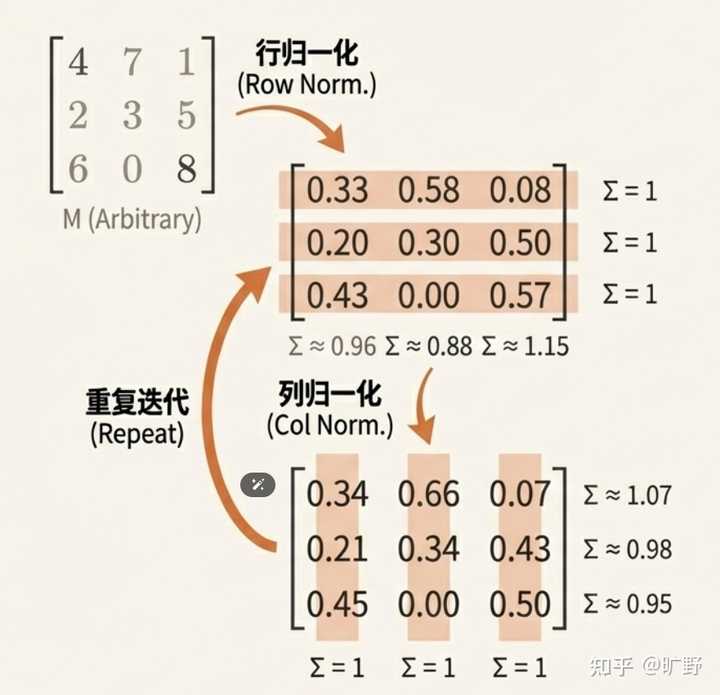 HC 与 mHC 的代表性单层/复合映射可视化;图中同时标注前向信号增益(行和)与反向梯度增益(列和)。mHC 的映射更接近“前后向增益≈1”的稳定传播目标Sinkhorn 迭代——优雅的投影算法 理论上的说完了,怎么保证训练过程中,矩阵始终落在双随机流形上? 这就涉及到一个经典的算法:Sinkhorn-Knopp 迭代。 算法的思路也很简单,有点像”打乒乓球”。比如你有一个普通的矩阵,想把它变成双随机矩阵,那就这么干: 先把每一行做归一化(让行和变成 1)再把每一列做归一化(让列和变成 1)但这时候行和又不是 1 了… 没关系,再归一化一次如此反复,来来回回地”打” |