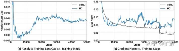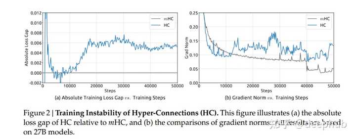 残差连接、HC 与 mHC 的结构对比。mHC 的关键是在残差映射上加入“流形投影”约束,从而在拓扑更复杂的同时保持训练稳定性。先搞清楚问题在哪 在聊mHC之前得先理解HC到底解决了什么问题,又制造了什么新问题。 传统的残差连接,公式大家都熟悉得不能再熟悉了: \mathbf{x}_{l+1} = \mathbf{x}_l + \mathcal{F}(\mathbf{x}_l, \mathcal{W}_l) \\ 就这么个简单的东西,支撑了Transformer这十年的繁荣。为什么?因为恒等映射这个性质实在太好了——信号从浅层直接传到深层,不修改、不衰减、不放大。梯度反传的时候也是如此。 但HC觉得 你这残差流太窄了,我给你扩展成n条流,再用可学习的矩阵去mix它们。 这想法确实很好。你想啊,原来的残差连接就是个 1×1 的"矩阵",其实就是个标量 1,现在变成 n×n 的可学习矩阵,拓扑复杂度一下子就上去了。而且关键是——不增加 FLOPs,只是多了点小矩阵运算。 HC在小规模实验上效果确实不错。但随之而来的也有问题: 规模一上去就炸了。 论文里有个很有意思的图(Figure 2),27B 模型训练到 12k step 左右,HC 的 loss 突然飙升。与此同时,梯度范数也开始疯狂震荡。 |