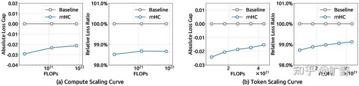 27B 模型在 8 个下游 benchmark 的 zero/few-shot 表现对比。mHC 在多数任务上优于 baseline,并在多项任务上超过 HC 8 个 benchmark,mHC 全面超越 baseline,在大多数任务上也超过了不稳定的 HC。 BBH 相对 baseline提升 7.2 个点,这个幅度在 27B 规模上已经非常可观了。要知道这只是通过改残差连接的拓扑结构实现的,没加参数、没加数据、没改训练流程。 更重要的是稳定性。mHC 的 loss 曲线平滑得像 baseline 一样,梯度范数也很稳定。而 HC 在 12k step 附近那个 loss spike... 在大规模训练中这种抖动是要人命的。Scaling实验也很漂亮。从 3B 到 9B 到 27B,mHC 相对 baseline 的优势始终保持。这说明这不是小模型上的 overfitting,而是真正的架构改进。 |