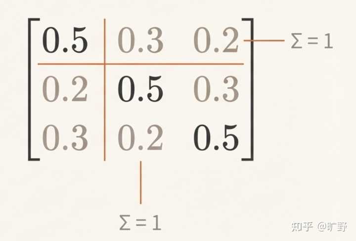 HC 的残差映射在单层与跨层复合后会显著偏离恒等映射,Amax Gain Magnitude 出现极端峰值(可达 3000 量级),对应前向信号与反向梯度的爆炸/消失风险。 这个信号在残差流里被放大了 3000 倍。在大规模训练中,这就是爆炸的前奏。 mHC的核心——为什么偏偏是双随机矩阵? 好,问题搞清楚了。现在 DeepSeek 的解法来了。 mHC 的核心思想给个省流版就是: 把残差矩阵 \mathcal{H}^{res} 约束在双随机矩阵构成的流形上。 等等,什么是双随机矩阵? 简单点看就是一个”特别均匀”的矩阵——所有元素都是非负的,而且每一行加起来等于 1,每一列加起来也等于 1。 比如一个 3×3 的双随机矩阵,它可能长这样: |