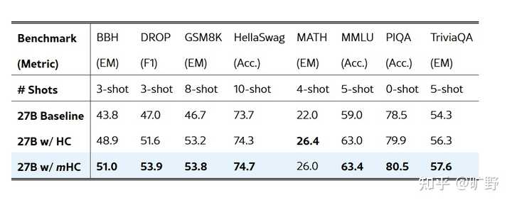 6.7%,考虑到 mHC 带来的性能提升和训练稳定性改善,这点代价简直可以忽略不计。如果有人告诉你,多花 6.7% 的训练时间,就能让你的 27B 模型在 BBH 上涨 7 个多点、在 GSM8K 上涨 7 个点,你干不干? 这笔账,怎么算都是血赚。 实验结果带来的全面碾压 27B 模型的实验结果,说实话有点夸张: |