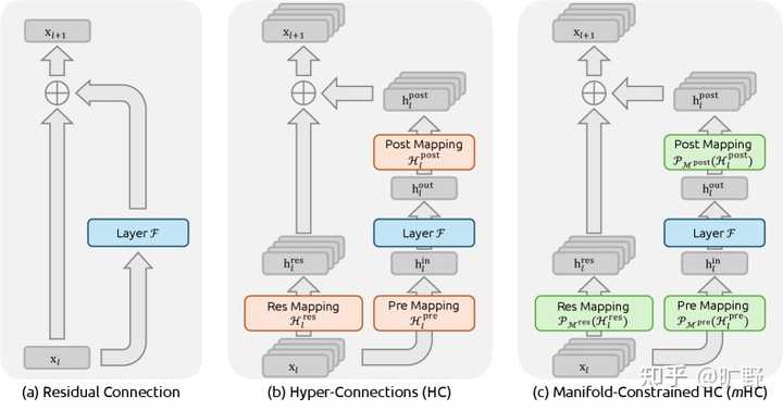 重点就是,虽然我以二维方式表达三维地球并不是全貌,但是看起来也能有我这个维度需要的所有信息,可以看得懂。 对于神经元网络中的数据空间,也存在这种N维数据可以在低维度看起来是连续平滑的流形。 那么,什么是mHC 我们再来看DeepSeek论文中的图,最右侧就是mHC,对比HC就很清楚了。 |