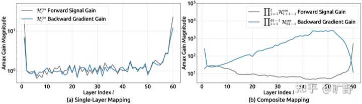 HC 在 27B 规模下出现训练不稳定:相对 mHC 的 loss gap 在约 12k step 附近突增,同时梯度范数剧烈波动。 为什么会这样?原因其实不难理解。 当你把单层的残差映射矩阵 \mathcal{H}_l^{res} 连续相乘 L 层之后: \prod_{i=1}^{L-l} \mathcal{H}_{L-i}^{res} \\ 由于这些矩阵是unconstrained的,这个复合映射可以往任意方向发散。论文测量了一个叫 "Amax Gain Magnitude" 的指标——这个值在 HC 里飙到了 3000。 |