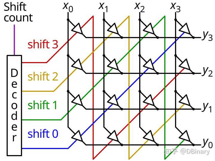 但是,串行移位寄存器有个比较致命的问题,就是比如这个n很大的时候,比如当n=114514,岂不是说我们每次移位运算都需要花费114514个时钟周期,这显然是不可接受的。 因此,我们让问题变得更有趣一点。 现在的CPU怎么在一个时钟周期内算出2的n次方? 马上,这个50个人能答上来的问题就只剩下不到10个人能说出一二了,这是现代CPU实际采用的实现方式了,又称为桶形移位器,它本质上是多级多路选择器(MUX)嵌套组合的结果。 |
