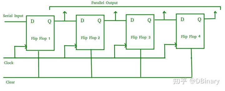 当然,对于有集成电路设计或FPGA设计经验的同学来说,这个问题仍然相当的简单,所以为了让问题变得再有趣一点,我们再次修改一下这个问题。 现在的CPU怎么算出2的n次方? 当64换成了一个变量n,很快这个原本100人能答上来的问题只有一半人能答上来了,你发现问题变得棘手起来,因为n是一个未知数,我们无法通过直接连线的方式来实现移位运算,那么能不能这样,我们专门设计一个移位寄存器,每一次运算我们就把这个寄存器左移一位,当然可以,这是一个非常经典的串行移位寄存器,在每个CPU时钟来时,这个寄存器就可以左移(或者右移)一位,这仍然是一个不太复杂的设计,因为多数寄存器位宽不高,多数时候我们使用几个或者几十个时钟周期就能完成运算,而串行移位的实现结构很简单成本极低,因此在很多场景都有这样的设计。 |