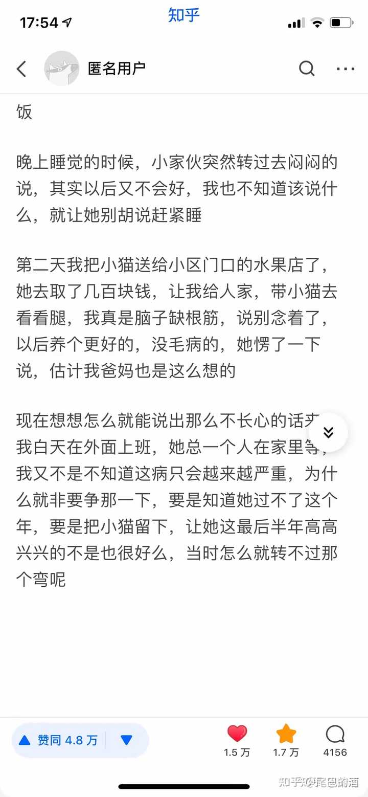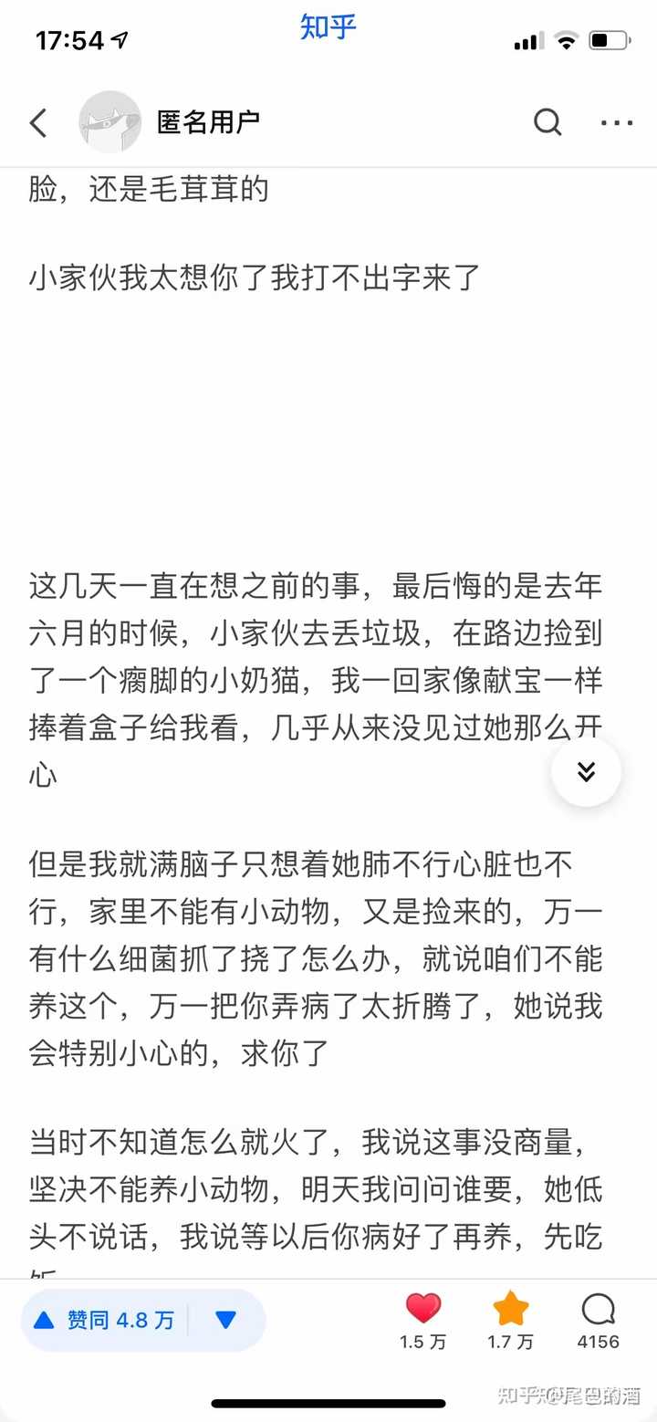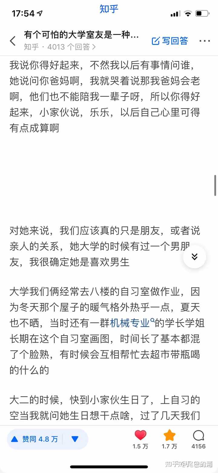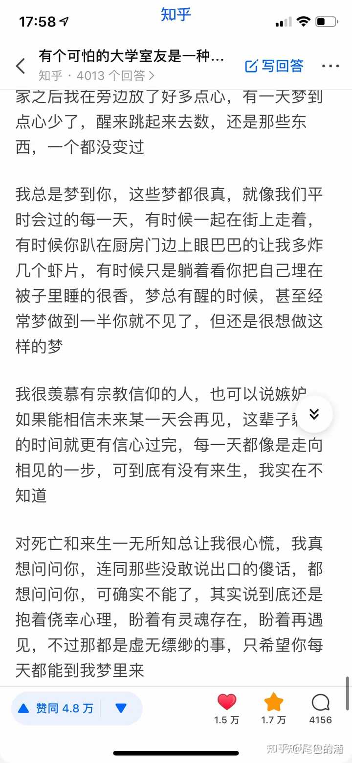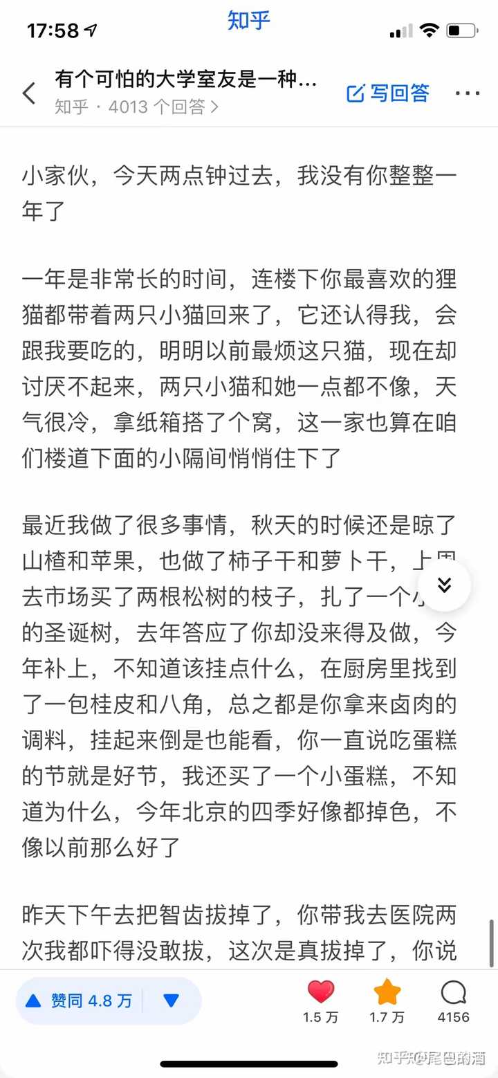 对这个回答印象太深刻了,当时是2019年,但是后来应该是被删掉了。初看只对小家伙感到心疼,看得次数多了却更被乐乐深沉的爱与善良打动,总是忍不住回想,也盼望真的有灵魂存在,不知道答主有没有真的生个女儿,希望答主一切都好,猫蛋狗蛋下辈子还要在一起啊…… 原来的问题是“有个可怕的大学室友是一种什么样的体验”记得当时底下有很多评论,还有答主的的回复,其实现在也很想再看看,但也已经都找不到了,如果有人记得当时的评论能不能麻烦也讲一讲,很感谢…… 注:原答主说过不要把这篇回答改编成小说或剧本,不要转载到知乎以外的平台(具体原话找不到了),谢谢大家。 翻出来旧手机补了一点当时的评论区回复,放在最下边了。 |