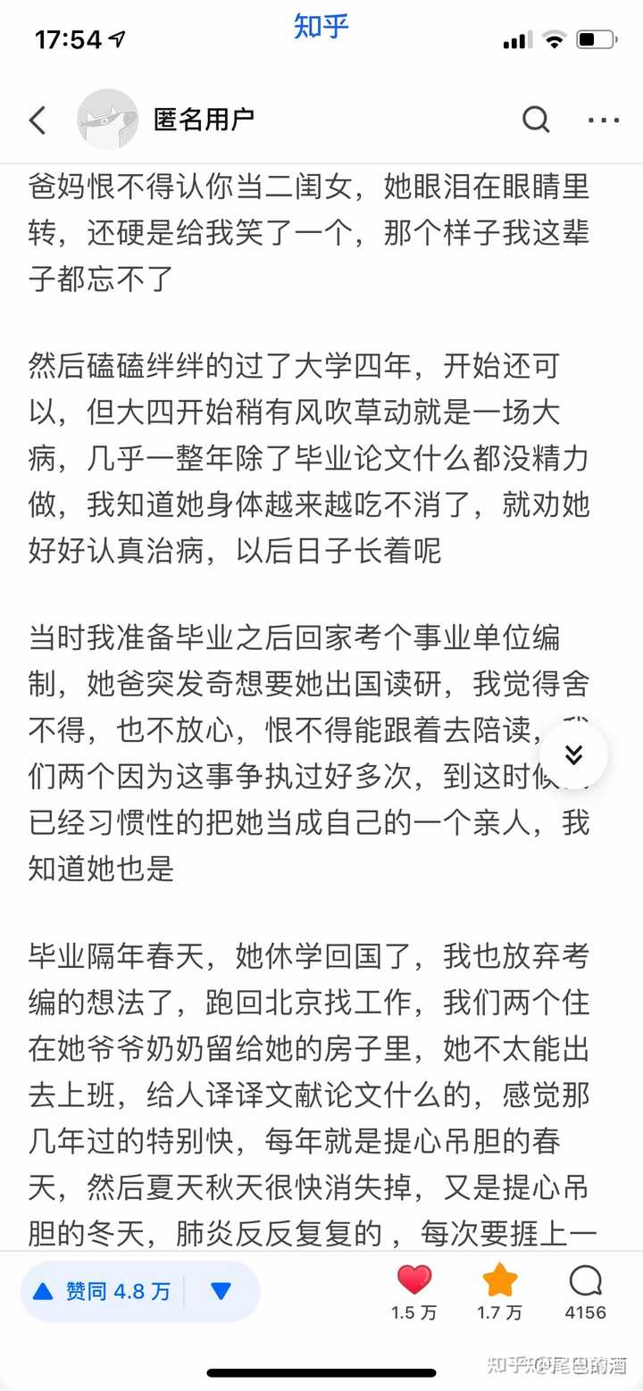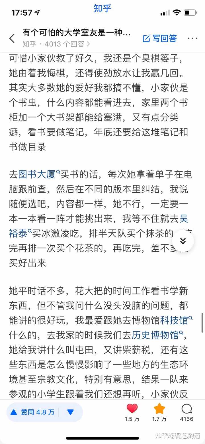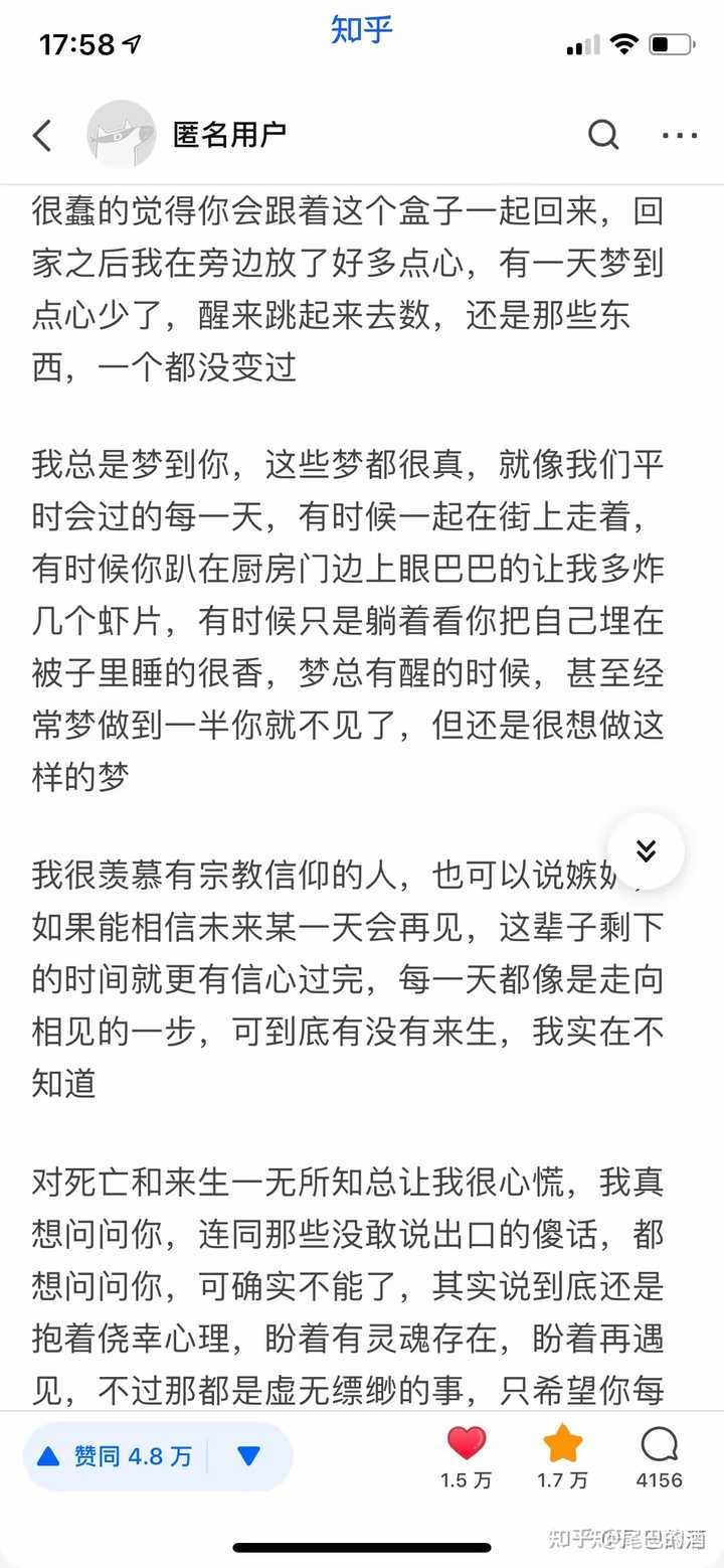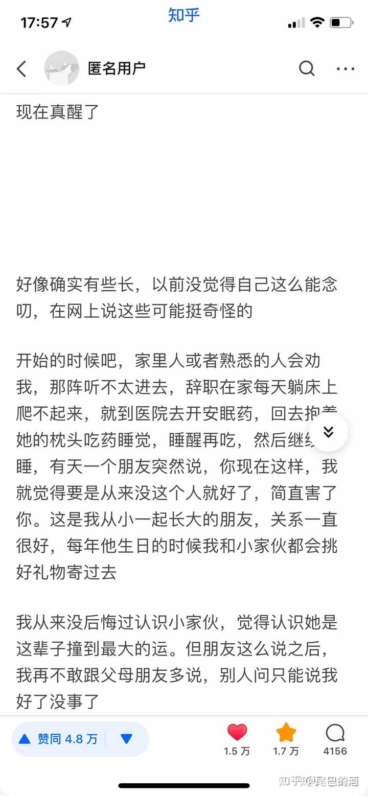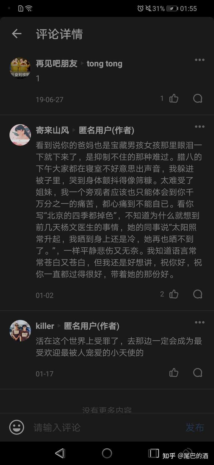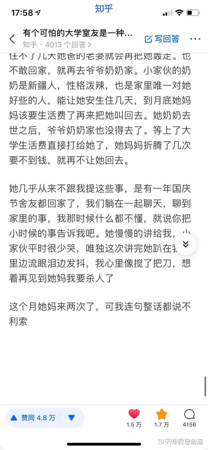 对这个回答印象太深刻了,当时是2019年,但是后来应该是被删掉了。初看只对小家伙感到心疼,看得次数多了却更被乐乐深沉的爱与善良打动,总是忍不住回想,也盼望真的有灵魂存在,不知道答主有没有真的生个女儿,希望答主一切都好,猫蛋狗蛋下辈子还要在一起啊…… 原来的问题是“有个可怕的大学室友是一种什么样的体验”记得当时底下有很多评论,还有答主的的回复,其实现在也很想再看看,但也已经都找不到了,如果有人记得当时的评论能不能麻烦也讲一讲,很感谢…… 注:原答主说过不要把这篇回答改编成小说或剧本,不要转载到知乎以外的平台(具体原话找不到了),谢谢大家。 翻出来旧手机补了一点当时的评论区回复,放在最下边了。 |