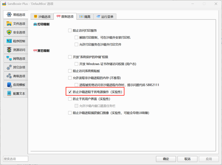 可以看B站边亮的视频,已经把原因分析出来了。是百度网盘修改了电源设置,导致CPU降频,以下是原视频出处。 我在这里给大家提供一个对付此类软件一劳永逸的办法--Sandboxie Plus。 Sandboxie Plus 是经典沙箱工具 Sandboxie 的开源升级版本,为 Windows 创建隔离虚拟环境。程序在沙盒内运行时,文件、注册表修改与网络行为均被限制在沙盒中,关闭后可一键清除痕迹,可以授予虚假的UAC权限(弹出界面根据文字提示点“否”),防止恶意软件感染系统或权限滥用。 把百度网盘安装在沙箱中,通过设置,可以限制其对电源设置进行修改。 |