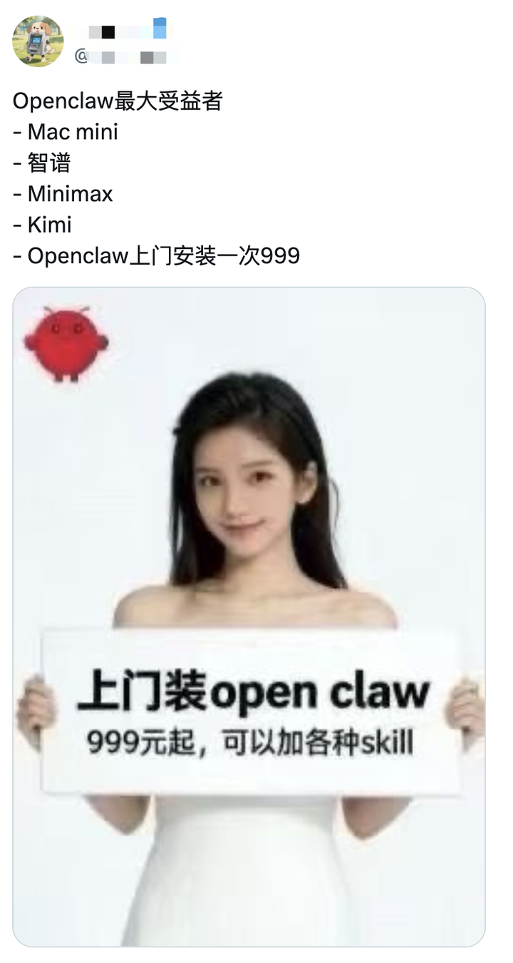 话说回来,你要是真看不上这些小肌肉渣男骗用户/异性的钱,那你就应该努力宣传,告诉潜在用户:你根本不需要在你家里安装OpenClaw,因为OpenClaw早就上云了! 上云,知道吗?这是云计算的时代,在云端你就可以租一个OpenClaw节点,下单立刻就能用,用不着等人上门,交钱立刻就有一个专属于你的AI个人助理! 在国内,已经有XX云、KxxxClaw、MxxClaw提供这样的OpenClaw节点服务,这不比上门安装强太多了。 对,就这么说,这样提供最大的情绪价值。 摆脱肌肉男思维,展示小巧肌肉就够,这样才能获得大量用户。 不过,当我在X上看到这条推,进一步震碎了我的三观: |