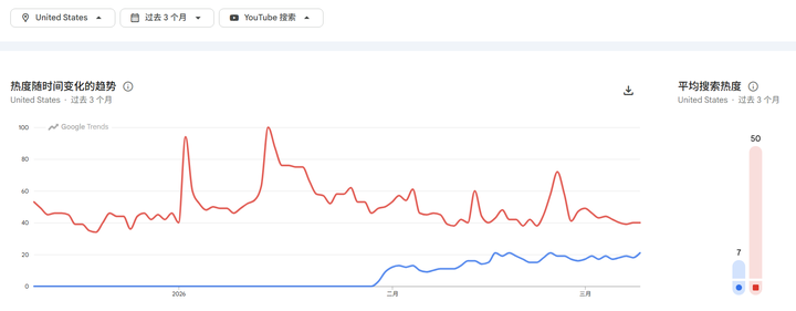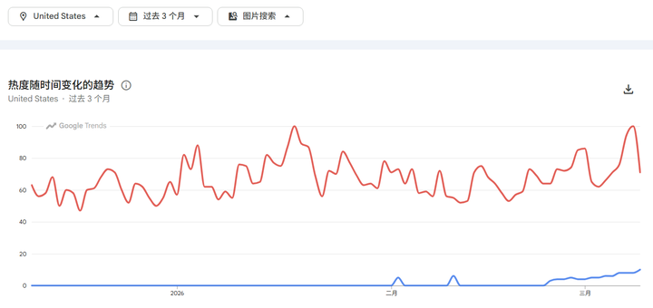 下面是美国范围的,网页搜索,蓝线是 OpenClaw,红线是用于对比的 Genshin: |