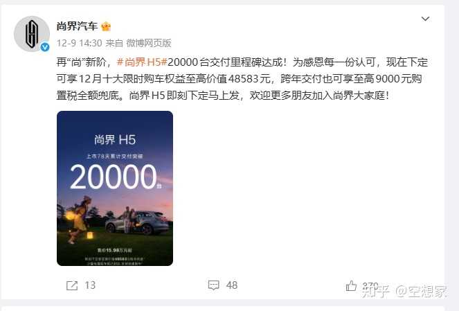 此外,尚界H5的定位也是很直接,就是让消费者在20万内也能拥有不打折扣的智能体验。当然尚界H5的销量也印证了市场对尚界H5实力的认可,上市仅43天就交付破万,创下了中国新势力品牌最快交付破万纪录,到火速冲刺达成2万辆交付里程碑,这份成绩单印证了市场对尚界H5产品硬核实力的高度认可。 |