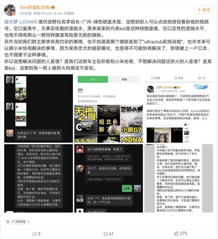 然而讽刺的是,几个月后两辆车的现实境遇确实天差地别,只不过是反过来的: 尊界S800上市67天,大定突破10000台,即将在8月中下旬开启大规模交付; 更可怕的是,第三方数据统计显示,尊界的大定走出了跟M9相似的逆跌走势! 一般来说新车上市时热度最高,后续订单可能逐步下滑。 然而初代问界M9和尊界S800却恰好相反,上市后一段时间内订单反而逆势增长! 只要后续真车交付不出问题,尊界S800很有可能在顶级富豪人群中复刻问界M9的口碑裂变! 反观小米su7ultra,上市后可谓风波不断,先后闹出“龙晶风道”、“续航不足”、“锁马力又放开”等等诸多争议。 更夸张的是,小米su7Ultra弃单太多新增订单不足,小米担忧两万定金不足以弥补损失,竟然祭出了强行催尾款的“奇招”。 小米强行催尾款的行为,不仅彻底惹恼一批车主,还将小米“退车冷静期”、“无乙方合同”等等奇思妙想曝光在镜头前; 某些米系KOL为了把真金白银掏钱的准车主打成“黄牛”,甚至不惜伪装成车主潜伏进维权群,试图在群聊中寻找所谓“证据”截图外传。 |
