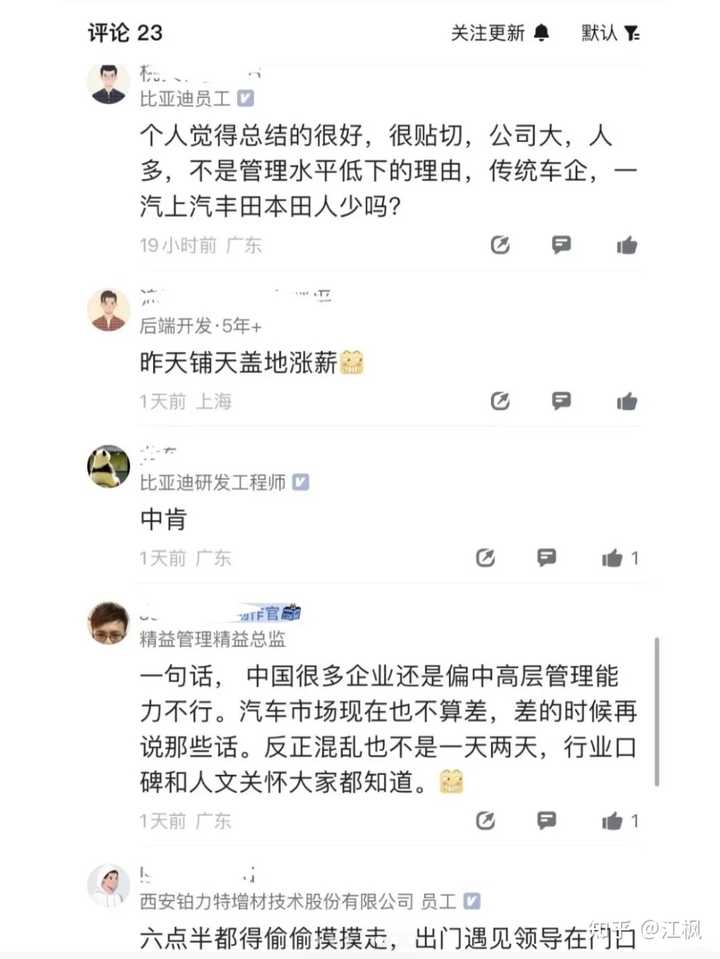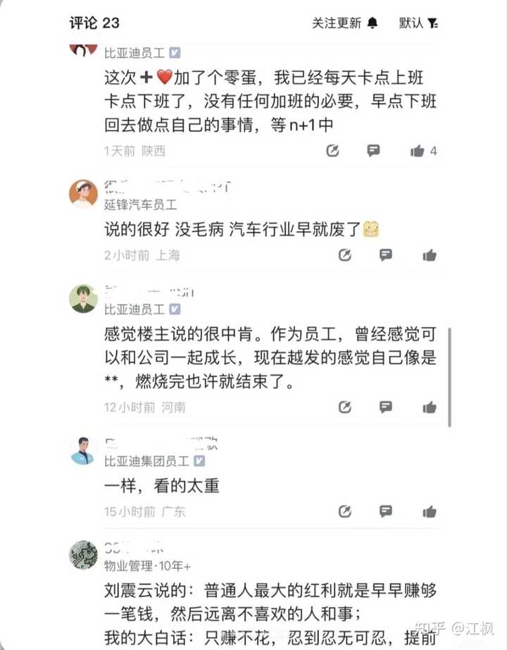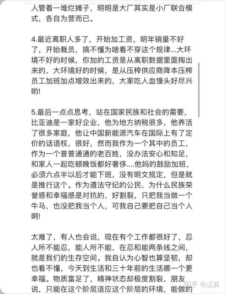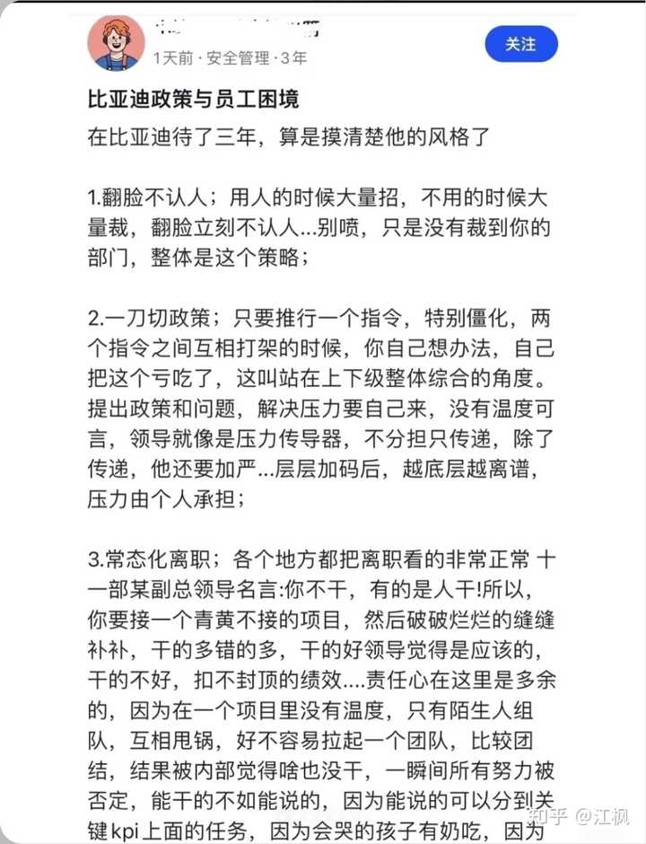 新出炉的帖子,从比亚迪员工的视角,或许能看出一些原因: 在比亚迪待了三年,算是摸清楚它的风格了 1.翻脸不认人;用人的时候大量招,不用的时候大量裁,翻脸立刻不认人...别喷,只是没有裁到你的部门,整体是这个策略; 2.一刀切政策;只要推行一个指令,特别僵化,两个指令之间互相打架的时候,你自己想办法,自己把这个亏吃了,这叫站在上下级整体综合的角度。提出政策和问题,解决压力要自己来,没有温度可言,领导就像是压力传导器,不分担只传递,除了传递,他还要加严...层层加码后,越底层越离谱,压力由个人承担; 3.常态化离职;各个地方都把离职看的非常正常十一部某副总领导名言:你不干,有的是人干!所以,你要接一个青黄不接的项目,然后破破烂烂的缝缝补补,干的多错的多,干的好领导觉得是应该的,干的不好,扣不封顶的绩效....责任心在这里是多余的,因为在一个项目里没有温度,只有陌生人组队,互相甩锅。好不容易拉起一个团队,比较团结,结果被内部觉得啥也没干,一瞬间所有努力被否定,能干的不如能说的,因为能说的可以分到关键kpi上面的任务,因为会哭的孩子有奶吃,因为人管着一堆烂摊子,明明是大厂其实是小厂联合模式,各自为营而已。 4.最近离职人多了,开始加工资,明年销量不好了,开始裁员,搞不懂为啥看不穿这个规律...大环境不好的时候,你加的工资是从离职数据里面掏出来的,大环境好的时候,是从压榨供应商降本,压榨员工加班加点增效出来的,大家吃人血馒头好尽兴哟! 5.最后一点点思考,站在国家民族和社会的需要,比亚迪是一家好企业,他为地方纳税很多,他养活了很多家庭,他让中国新能源汽车在国际上有了定价的话语权,很好。然而我作为一个其中的员工,作为一个普普通通的老百姓,没办法安心和知足,和家人一起吃顿晚饭都好奢侈....TM的鼓励加班,必须六点半以后才能下班,没有明文规定,但是就是推行这个。作为遵法守纪的公民,为什么民族荣誉感和幸福感是对抗的,好割裂。只把我当做一个牛马,也没把我当个人,可我自己要把自己当个人啊! 太难了,有人也会说,现在有个工作都很好了,忍人所不能忍,能人所不能,在忍和能两条线之间,就是我们的生存空间。我自认为心智也算坚韧,却也看不懂,今天到生活和三十年前的生活哪一个更幸福。物质富足了,精神状态却极度割裂,朋友说,只能在这个阶层适应这个阶层的环境。 |