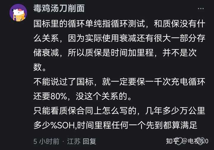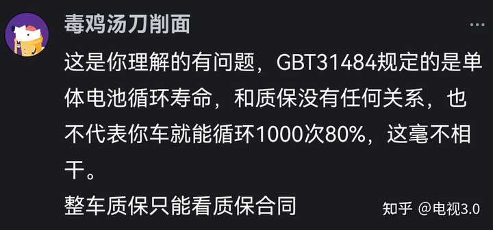 这位朋友很厉害,今天的回复就基本上是这个意思。我的车现在是13.8万公里,每百公里15kwh计,138000/100×15=20700kwh,20700/47=440.4255319,目前大概是440次完整循环,远未达到1000次循环。 我留意到今天长城的回复提到:“技术部门反馈,31484-2015这个国标文件是只属于要求厂商整车车辆生产时的国家标准,是针对动力新电池电池检测验证通过之后才允许上市的一个检测标准,这个标准不适用使用过的动力电池的检测方法。” 于是我强调:这是一个法务问题,法务问题解决了,才能技术上解决问题。我要求,让法务来解决这个问题。车辆的电芯既然已经执行了(GB/T 31484-2015),那么电芯质保期内必须符合该标准,这是法务人员的基本常识。技术人员不了解法务,才得出这样子的回复。 这事的诡异之处是,厂家和4s店一直在论证我这个电池不应该换,不断去证明十几天前4s店检测认为电池合格。而不是从事实出发去解决问题。 11月26日 今天没有去询问进展,倒是4s店约我明天一起测量一下充电量。 因三包凭证未对电池衰减值约定,根据《民法典》第五百一十一条,合同未约定质量要求时,优先适用强制性国家标准;无强制性标准则适用推荐性标准。 有网友提出GBT31484适用性疑问,这个标准要求:1000次标准循环测试不低于80%,500次标准循环测试不低于90%。标准未对工况循环测试作衰减数值规定。 我这个车估算约经历了440次循环,三包凭证约定8年或15万公里电池质保,厂家未在三包凭证中约定衰减数值,存在过错,我依据民法典,主张衰减限值执行80%。 |