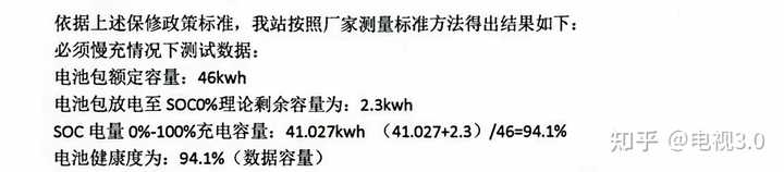 以下是个人经历,交涉电池衰减问题。 (先声明,并不是因为冬天,气温低,电池容量比正常时低。广东的气温并不低,下文11月14日,11月27日测充电电池容量时,气温均在20-25摄氏度之间,属电池工作的最佳温度范围。) 以下正文 我的车质保8年或15万公里,行驶了6年13.8万公里,动力电池原46.5度容量,现在能充进去36.5度。三包凭证中,未对衰减限值作约定。 开去4S店检测电量,2025年11月14日检测完后,回复我说,能充进去41度(怎么充进去的?开着空调充?或造数据?这个我未来会要求复现),再加上2.3度理论剩余电量(这个是什么鬼?先不扯),于是计算得出94.1%。 |