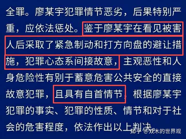 三条人命,两个刚30岁的大好青年,一个还不到一周岁的婴儿,,就换来一个死缓。 在通告里,法院解释了为什么对廖某宇判了死缓。 理由有两点: 第一,他在看到快撞到人的时候,紧急刹车了,还打了方向盘。 所以他这是属于间接故意,而不是蓄意报复社会。 第二,案发后,廖某宇先后拨打了报警电话,并在现场等候处理,具有自首情节。 由此,法院给他判了死缓,而不是立即死刑。 |
