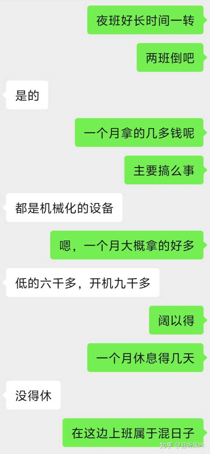 不说比亚迪也不说华为,说个其它企业吧,亿纬锂能,这是湖北荆门厂区一个普工的待遇,这是我跟他昨天的部分对话记录 对话人是我朋友,湖北京山人,40岁,学历好像是初中未毕业,两个娃,养过鸡,亏了,干过工地,走过南闯过北,风吹雨淋,典型的朴实的农村人 现在在老家一个月六千多,一顿饭三块钱,还有五险一金,老家往返一趟两个小时就行,要知道,我们那儿的老农民就算是在地里苦一年,都苦不到一万块钱 最后,我只希望这样的企业越来越多,我也愿意由心的喊投资人一声哥 更正下,朋友说厂里车间普工给的是13薪,然后说全年无休是不严谨的,春节会有七天年假,至于其它节日有没有假期,我没有具体多问,平时想休息也可以请假,他基本每个月都会回老家一趟。如有误导,抱歉了 2026年1月24日,小透明再次更新下,首先很感谢大家的点赞,没有想到一个简单发言,会引起一些人的共鸣。当然,也感谢那些反对质疑的声音,或许正是你们的发声,才会给更多人带来更多的权利与福利,反对与质疑也会带来进步,没有任何事物一定是伟光正的 安得广厦千万间,大庇天下寒士俱欢颜 下面的话语,我只是根据我个人看待问题的角度,对一些事情进行回复,有异议正常,毕竟每个人看待问题肯定存在差异 评论区会有些声音,有的是带有怨气的,有的是不遵守劳动法的,有的会觉得人力不值钱的,这些我都理解,包括我自己都在说,太狠了,太熬人了,太熬时间了,但事物需要多维看待 关于劳动法,劳动法去算最理想状态如下,荆门市普工不管吃住一个月3452,管吃管住一个月六千多,你觉得多数人会选哪个?别总想的太理想化,大众会用脚去投票的 关于没时间谈对象,这个东西见仁见智吧,有的人就是把他塞女儿国他也谈不到啊,比如我这种。据我所知,还有很多特意进厂去找另一半的,朋友说有很多一个人进去,两个人出去的那种,一会我把截图放在最下面,免得影响大家观感 关于休息,你去了他又不能限制你人身自由,你觉得接受不了的东西你可以走,你接受不了说明你退路比别人多可选择比别人多。这对于没文化没技术没年纪可选择不多的人,又想离家近的,未尝不是种暂时性选择。有的人觉得蛋炒饭就很香,有的人觉得山珍海味才是吃食。你也不能因此否定别人为当地提供的机会,就业,人流,发展,机遇等等,事情不能脱离实际因素去看,事情也是相对的,谁不想理想化些呢,谁不知道熬夜班艰辛呢,谁不想周末双休呢,对吧 关于工资低,对于我的理解,能带动城市发展,能让农村孩子不当留守儿童,能给予广大底层一口还不错的饭吃,他就是个好人。这份工作对于选择不多的人不妨碍它是个好去处,对于暂时迷茫的人,它也是个不错的过渡选择。当然,我也希望你能帮很多很多人找到早九晚五双休月薪一万八的工作 我在武汉,这里太多每个月三五千不管吃住的工作与人了,每天除掉生活开销,住房水电,路程往返,一年能存下来多少钱呢?看上去很体面而已,有些甚至早上买个包子,是买一个还是两个,都要犹豫好久。而我朋友一个月六千多,厂里管吃管住的,一个月也能落个四五千左右 至于有些人高高在上抬起头,满是傲慢,却不肯低头看看脚下的泥与芸芸众生。这个国家多数都是底层劳动人民,一直还处于发展阶段,任何事情都不能脱离实际因素去看待,也不能跳过阶段阶层去看问题。不然听来甚至有些肉食者鄙,何不食肉糜的意味。很多人会觉得辛苦,不值得,我知道你们是心怀善意的,但是有些实际因素,是我们不得不接受的 每个人能力有大小,如果我朋友和很多人一样985或211的,还去挣这个六千多的苦命钱,那我肯定会觉得不值得,我也希望他年入百万,但是他不具备这个价值与能力啊,我得站在他的角度能力去看待问题,人不能脱离自身能力价值去谈报酬 社会的发展从来不是一蹴而就,这个社会由万千人万千职业构造而成,从农民从无业从工人从大厂牛马从土木狗从金融从政府部门从航天,每个人都在有生命力的跳动着,但只有脚踏实地才能向前。正因为每个我们,才有了今天我们对话交流的机会 感谢你们的质疑,至于那些只知道嘲笑的阴洋怪汽的蛙蛙,希望你们一辈子对任何人任何事都会阴洋怪汽,记得保持这样的品性哦 嗯,好了,吵扰到大家了,谢谢 |