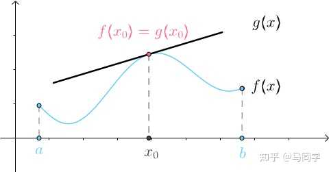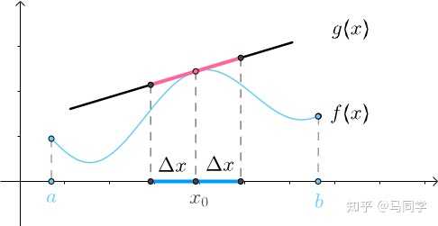 下面要更进一步,不过不要太贪心,只希望两者在x_0 附近尽量相等。比如像下图一样,在(x_0-\Delta x,x_0+\Delta x) 的区间内,曲线f(x) 和直线g(x) 相差很小: |