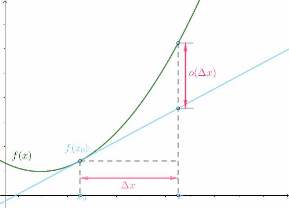 这点如果可以做到,那就可以按照上一节说的,将曲线分成n份,每份都用各自的微分来近似。 2.2 代数分析 通过几何分析,思路已经理清楚了,要找的微分(直线)需要满足以下两点: (1)曲线f(x) 和直线g(x) 要交于x_0 点。假设直线g(x) 的斜率为k ,那么根据点斜式,可得直线函数: g(x)=f(x_0)+k(x-x_0)\\ 这里面就是k 还未知,求出了k 就得到了想要的直线,也就得到了微分。 (2)曲线f(x) 和直线g(x) 要在(x_0-\Delta x,x_0+\Delta x) 的区间内尽可能相等。用代数表示即为: f(x)-g(x)\approx 0,\quad x\in(x_0-\Delta x,x_0+\Delta x)\\ 有约等号的式子是没法计算的,引入高阶无穷小o(\Delta x) 可以将约等号去掉: f(x)-g(x)=o(\Delta x),\quad x\in(x_0-\Delta x,x_0+\Delta x)\\ 高阶无穷小o(\Delta x) 的意思就是在\Delta x 这个范围内无限的接近于 0。至于为什么它无限接近于 0,以及为什么是高阶无穷小,在文章的最后会进行补充说明。 2.3 解出直线的斜率k 经过上面的分析我们有了: \left.\begin{aligned} g(x)=f(x_0)+k(x-x_0)\\ f(x)-g(x)=o(\Delta x) \end{aligned}\right\}\implies f(x)-f(x_0)-k(x-x_0)=o(\Delta x) \\ 这已经足够让我们解出直线的斜率k 了。注意到\Delta x=x-x_0 ,可以进行如下变形: \begin{aligned} f(x)-f(x_0)-k(x-x_0)=o(\Delta x) &\implies f(x)-f(x_0)-k\Delta x=o(\Delta x)\\ &\implies \frac{f(x)-f(x_0)-k\Delta x}{\Delta x}=\frac{o(\Delta x)}{\Delta x} \end{aligned} \\ 两侧取极限可得: \lim_{\Delta x\to 0}\frac{f(x)-f(x_0)-k\Delta x}{\Delta x}=\lim_{\Delta x\to 0}\frac{o(\Delta x)}{\Delta x}\implies \lim_{\Delta x\to 0}\frac{f(x)-f(x_0)-k\Delta x}{\Delta x}=0 \\ 略微作一下化简可得: k=\lim_{\Delta x\to 0}\frac{f(x)-f(x_0)}{\Delta x}\\ 至此我们就求出了k ,也就找到了f(x) 的 微分(直线g(x)的形式还需要变一下才是真正的微分,关于这点可以参考“dx,dy是什么?”这篇文章)。 这个k 在微积分中又有一个专门的名字,称为f(x) 的 导数。k如果存在(因为k是通过极限求得的,这个极限有不存在的可能),那么就称f(x)可导。 上面的思路还可以进一步思考,如果要找最接近曲线f(x) 的多项式曲线呢?这会得到泰勒公式,就留给大家作课后习题吧。 3 补充说明 这里补充说明两点: (1)高阶无穷小o(\Delta x) 为什么表示在(x_0-\Delta x,x_0+\Delta x) 的区间内无限接近于 0 ?这是因为它满足: \lim_{\Delta x\to0}o(\Delta x)=0\\ 上面这个极限式意味着\Delta x 越小,也就是越接近于x_0 点,o(\Delta x) 越接近于 0。用动画表示就是: |
