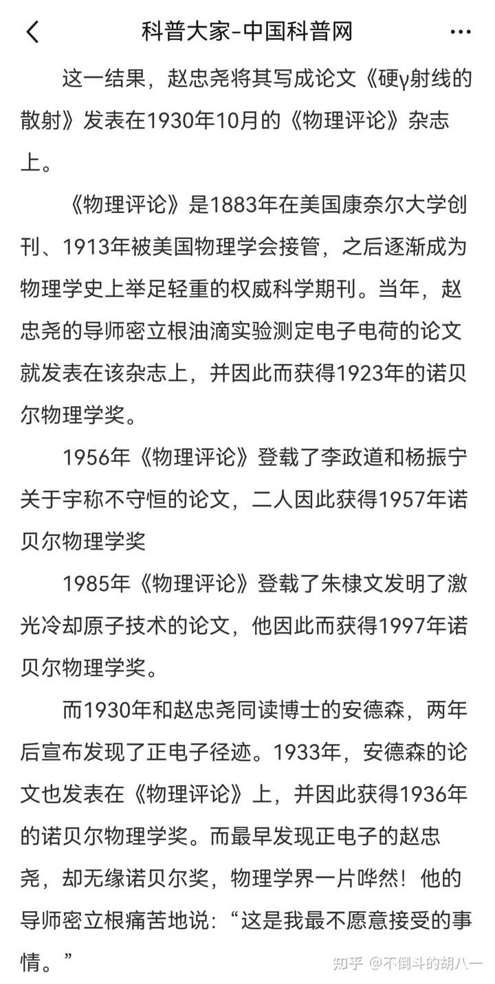 后来一个叫安德森的学术混混,把赵忠尧的实验又重复了一遍,得出来同样的结果。1936年瑞典皇家科学院不出意料的把诺贝尔物理学奖授予了抄袭者安德森。 |