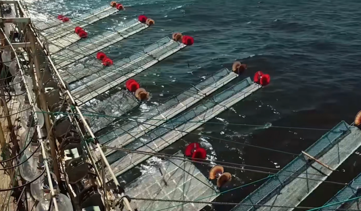 钓鱿鱼的钩子 然后被机器拽上来自动脱落, 整个过程基本上全自动完成,非常高效。 |
