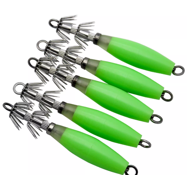 最前方是北美渔民展示的钓洪堡鱿鱼专用钩,较之一般鱿鱼钓钩更大且刺儿多 |