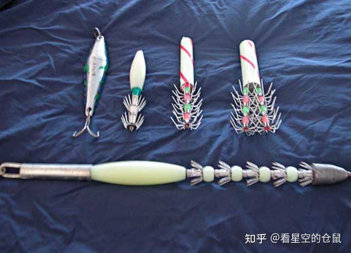 当然最重要的一点,鱿鱼价格比较便宜, 目前养殖远不如直接捕捞划算。 带鱼和鲅鱼至今没大规模养殖,部分也是类似的原因。 现代鱿鱼捕捞也蛮有意思,由于鱿鱼比较娇嫩且性情凶猛, 用网抓容易破坏品相,所以抓鱿鱼不少用的是专门的钓鱿船。 正常来说, 捕鱿船会先用船两侧大灯打绿光或者蓝光在水里,吸引鱿鱼过来。 然后船两侧有这种自动钓机, |
