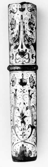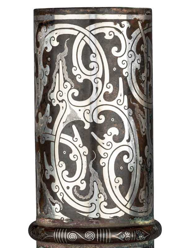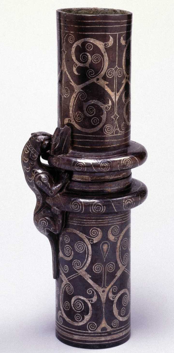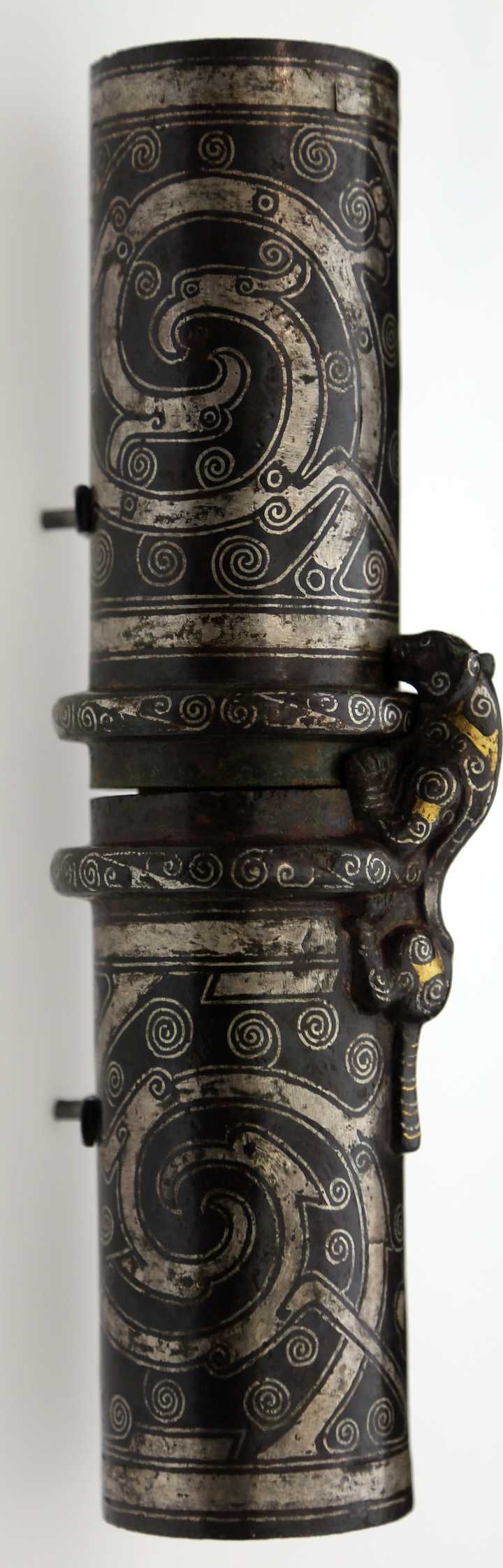战汉错金银方壶 西汉错银铜伞箍. 长42厘米,直径5.5厘米.器物本身错银的精致与华丽自不必赘言,仙山云气的细节在大图中可以欣赏,尤其是云气的艺术表达,既有铜地错银,也有在银地上露铜.伞箍本质上是车马器的一种,专门用在车伞支撑上。 |